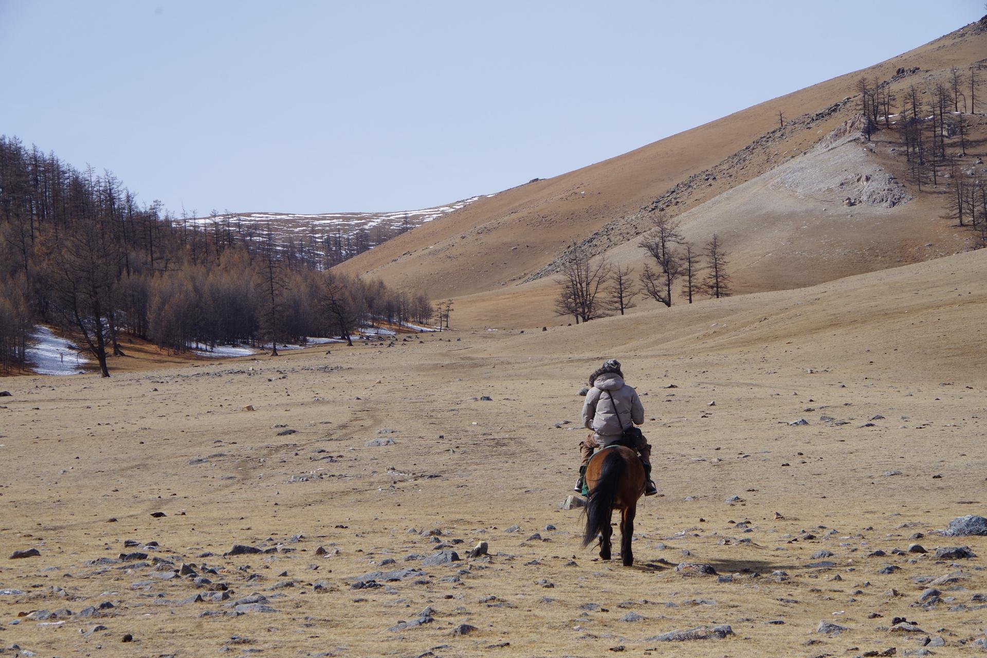French horseman in MongoliaLe cheval nous était acquis. Débutants que nous sommes, il suivait assez peu nos directives. Pas de problème pour rentrer les bêtes ou aller à la rivière pour boire de l'eau. En revanche, sortir de ses sentiers battus ou poser dix secondes pour une photo ne rentraient pas dans ses mords. Son impassibilité était à toute épreuve. Pas facile d'être un cheval en Mongolie.