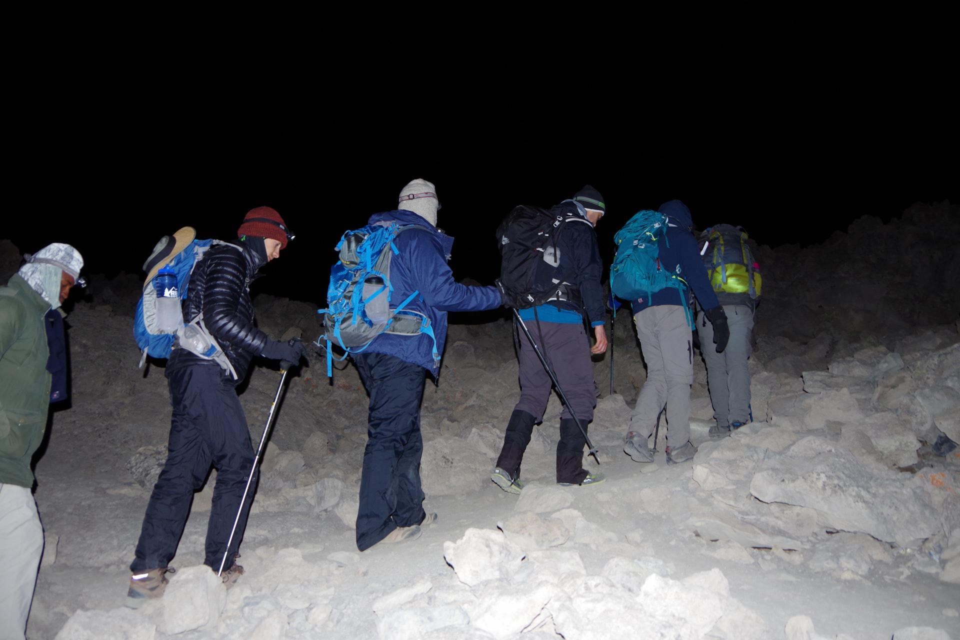 Les étoiles et leurs constellations nous offrent, comme depuis le début du trekking, un spectacle hors du temps. Il 23h30. Nous avons dormi trois heures. A minuit, Paul et Vasili semblent surpris de voir que nous sommes prêts. Eux ne le sont pas. Qu'est-ce que vous croyiez ? Notre détermination n'a pas changé. Beaucoup de groupes ont déjà prit de la hauteur. Si nous le pouvons, je suis bien décider à tous les dépasser un par un pour arriver les premier au sommet. Mais chaque chose en son temps...